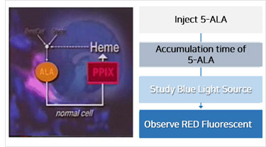 - Early cancer diagnosis by PDD for ALA can dramatically increase the rate of early detection of cancer patients by examining early cancer or dysplastic cancer (pre-cancer before cancer) through PDD, which could not be examined by conventional diagnostic methods. PDD can check for all early and dysplastic cancers, including lung, stomach, bladder, uterus, and throat, which can be identified by endoscopy, especially for regular examinations for recurrence after cancer surgery. It also serves as a guide for surgery such as brain tumors, bladder cancer, stomach cancer, and lung cancer, which show clear boundaries between cancer and normal cells. Due to these needs, Germany's KARL STORZ GmbH supplies fluorescent endoscopes for PDD worldwide. The 5-ALA, a phosphor-sensitive drug used in PDD, is the world's most popular with ALA conferences and regular ALA symposiums in the U.S. and Japan, and is rapidly expanding into the field of PDT procedures.